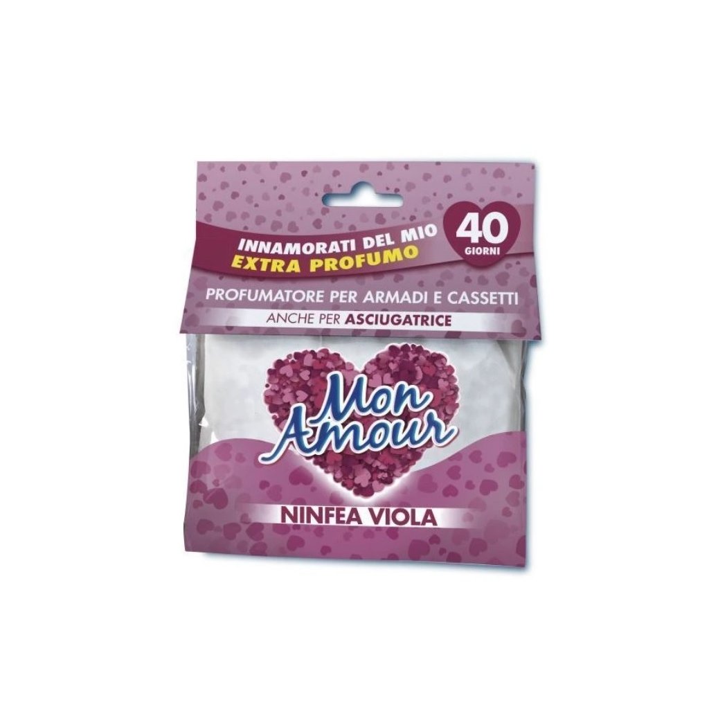 Parfumované vrecko do skríň, šuplíkov, športových tašiek a sušičiek na bielizeň Mon Amour Ninfea Viola zahalí vašu bielizeň do intenzívnej vône. Živé vodné a kvetinové akordy fialového lekna dodávajú pocit čerstvo vypraného prádla, ktoré uvoľňujú postupne svoju vôňu až po 40 dní. S praktickým otvorom na zavesenie a prírodnou nafúknutou ryžou.