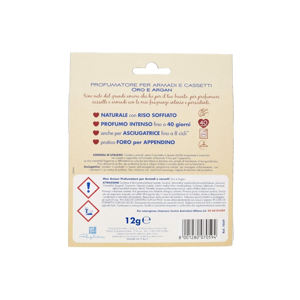 Parfumované vrecko do skríň, šuplíkov, športových tašiek a sušičiek na bielizeň Mon Amour Oro e Argan je hrejivá a zmyselná vôňa, ktorá vás obklopí orientálnymi tónmi arganu, vanilky a ambry.
