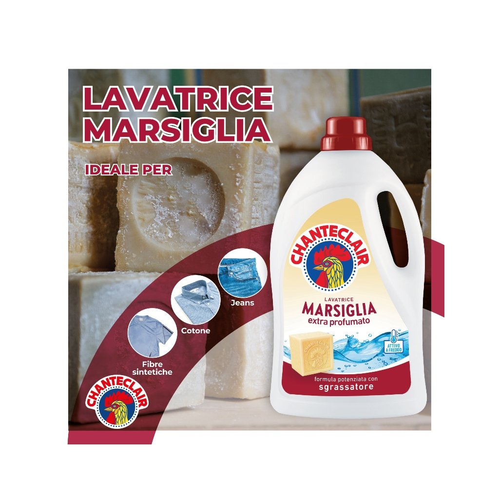 Prací prostriedok Chanteclair Marseille vďaka svojmu špeciálnemu koncentrovanému zloženiu a o 30% vyššej účinnosti v každej kvapke* odstraňuje aj tie najodolnejšie škvrny. Obohatený o skutočný odmasťovač zaisťuje čistú bielizeň od nízkych teplôt. *laboratórne testy, priemerná účinnosť na škvrny od kečupu, čaj, červená repa, olivový olej, škrob, čokoládová zmrzlina, čokoládový puding, vajce, krv v porovnaní s predchádzajúcim dávkovaním 61ml.